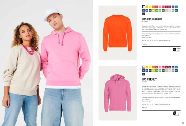Felpa girocollo. Tessuto morbido stabilizzato adatto ai lavaggi intensivi. Finissaggio antipilling. Costine 1 / 1 elasticizzate. Cuciture ribattute. Nastrino collo in twill.