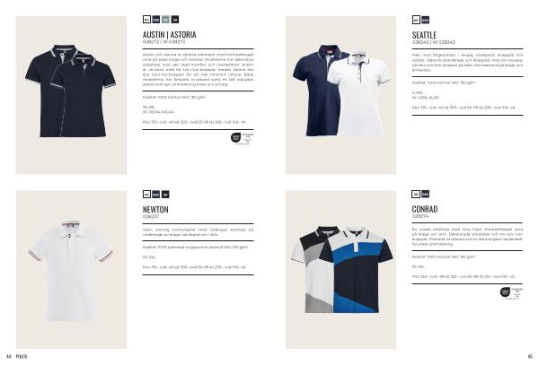 Austin och Astoria är stilrena pikétröjor med kontrastfärgad rand på både krage och ärmslut. Modellerna har dekorativa sidoslitsar som ger ökad komfort och rörelsefrihet. Austin är utrustad med tre ton-i-ton-knappar, medan Astoria har fyra ton-i-ton-knappar för ett mer feminint uttryck. Båda modellerna har förstärkt nackband samt en lätt avtagbar etikett som gör ommärkning enkel och smidig.