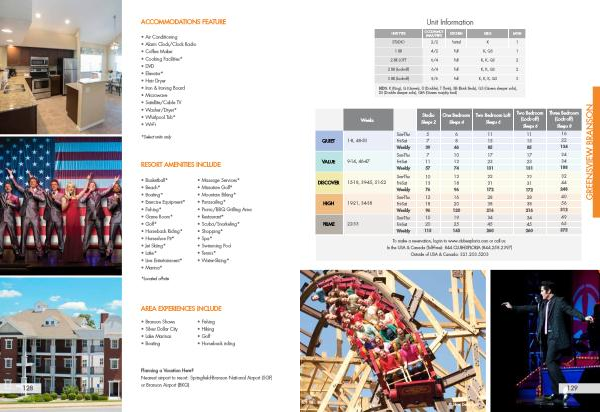 UNIT TYPE OCCUPANCY ( MAX / PRIV ) KITCHEN BEDS BATHS STUDIO 2 / 2 Partial K 1 Unit Information BEDS : K ( King ), Q ( Queen ), D ( Double ), T ( Twin ), BB ( Bunk Beds ), QS ( Queen sleeper sofa ), DS ( Double sleeper sofa ), QM ( Queen murphy bed ) Studio Sleeps 2 1-8 , 48-50 9-14 , 46-47 15-18 , 39-45 , 51-52 19-21 , 34-38 22-33 QUIET VALUE DISCOVER HIGH PRIME Sun-Thu Fri-Sat Weekly Sun-Thu Fri-Sat Weekly Sun-Thu Fri-Sat Weekly Sun-Thu Fri-Sat Weekly 7 11 57 5 7 39 10 13 76 12 18 96 To make a reservation , log-in to www . clubexploria . com or call us : In the USA & Canada ( Toll-Free ): 844 . CLUB-EXPLORIA ( 844.258.2397 ) Outside of USA & Canada : 321.203.5203 Weeks Sun-Thu Fri-Sat Weekly 15 20 115 One Bedroom Sleeps 4 10 12 74 6 8 46 12 18 96 16 20 120 19 25 145 Two Bedroom Loft Sleeps 6 17 23 131 11 15 85 22 31 172 28 38 216 34 45 260 Two Bedroom ( Lock-off ) Sleeps 6 17 23 131 11 15 85 22 31 172 28 38 216 34 45 260 Three Bedroom ( Lock-off ) Sleeps 8 24 34 188 16 22 124 32 44 248 40 56 312 49 65 375 1 BR 4 / 2 Full K , QS 1 2 BR LOFT 6 / 4 Full K , K , QS 2 2 BR ( Lock-off ) 6 / 4 Full K , K , QS 2 3 BR ( Lock-off ) 8 / 6 Full K , K , K , QS 3 GREENSVIEW BRANSON © Silver Dollar City 129