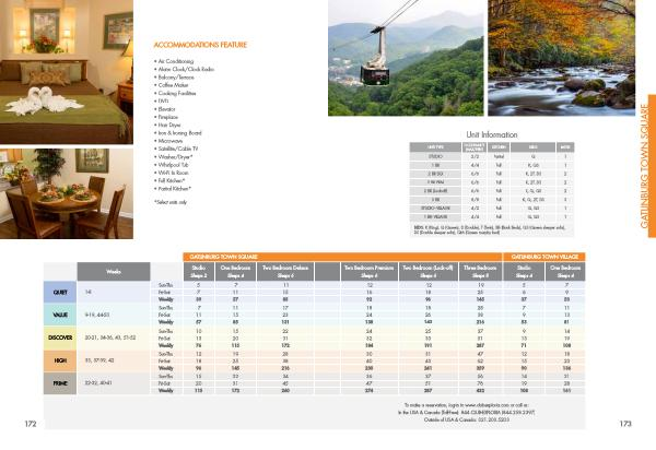 ACCOMMODATIONS FEATURE • Air Conditioning • Alarm Clock / Clock Radio • Balcony / Terrace • Coffee Maker • Cooking Facilities • DVD • Elevator • Fireplace • Hair Dryer • Iron & Ironing Board • Microwave • Satellite / Cable TV • Washer / Dryer * • Whirlpool Tub • Wi-Fi In Room • Full Kitchen * • Partial Kitchen * * Select units only Studio Sleeps 2 One Bedroom Sleeps 4 Two Bedroom Deluxe Sleeps 6 1-8 9-19 , 44-50 20-21 , 34-36 , 43 , 51-52 33 , 37-39 , 42 22-32 , 40-41 QUIET VALUE DISCOVER HIGH PRIME Sun-Thu Fri-Sat Weekly Sun-Thu Fri-Sat Weekly Sun-Thu Fri-Sat Weekly Sun-Thu Fri-Sat Weekly Sun-Thu Fri-Sat Weekly 7 11 57 5 7 39 10 13 76 12 18 96 15 20 115 11 15 85 17 23 131 7 11 57 11 15 85 15 20 115 22 31 172 19 25 145 28 38 216 22 31 172 34 45 260 Weeks GATLINBURG TOWN SQUARE 172