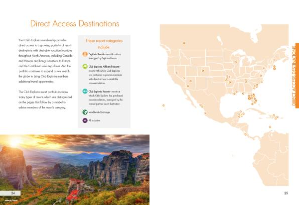 The Club Exploria resort portfolio includes many types of resorts which are distinguished on the pages that follow by a symbol to advise members of the resort ’ s category .
