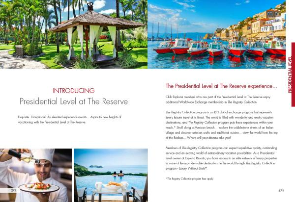 Members of The Registry Collection program can expect superlative quality , outstanding service and an exciting world of extraordinary vacation possibilities . As a Presidential Level owner at Exploria Resorts , you have access to an elite network of luxury properties in some of the most desirable destinations in the world through The Registry Collection program - Luxury Without Limits ® .