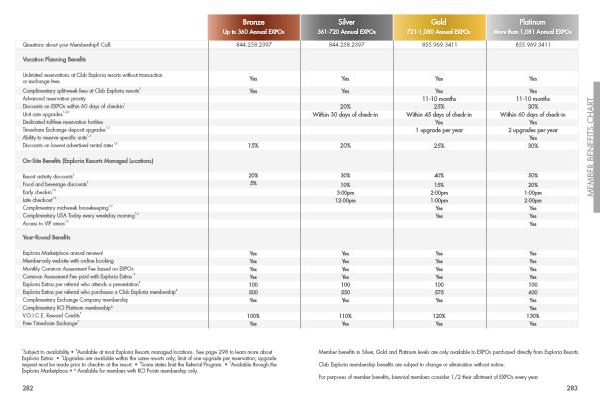 Complimentary split-week fees at Club Exploria resorts 2 Advanced reservation priority Discounts on EXPOs within 60 days of check-in 1 Unit size upgrades 1 , 2 , 3 Dedicated toll-free reservation hot-line Timeshare Exchange deposit upgrades 1 , 5 Ability to reserve specific units 1 , 2 Discounts on lowest advertised rental rates 1 , 2
