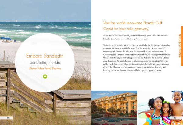 At the Embarc Sandestin , pristine , white-sand beaches , resort chairs and umbrellas lining the beach , and four world-class golf courses await .
