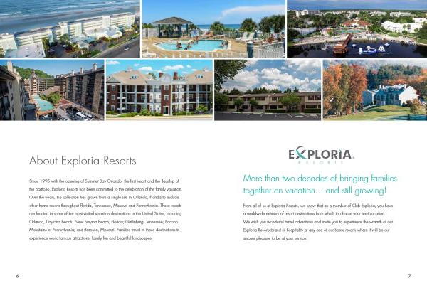From all of us at Exploria Resorts , we know that as a member of Club Exploria , you have a worldwide network of resort destinations from which to choose your next vacation . We wish you wonderful travel adventures and invite you to experience the warmth of our Exploria Resorts brand of hospitality at any one of our home resorts where it will be our sincere pleasure to be at your service !