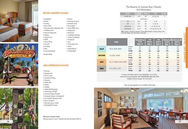 SUMMER BAY ORLANDO UNIT TYPE OCCUPANCY ( MAX / PRIV ) KITCHEN BEDS BATHS HOUSE- 3 BR 1 BR 2 BR 3 BR ( Lock-off ) 4 BR ( Lock-off ) 10 / 8 4 / 4 8 / 6 12 / 10 16 / 12 Full Full Full Full Full K , K , 2D , QS K , QS K , 2D , QS K , K , 2D , QS , QS K , K , 2D , 2D , QS , QS 3 1 2 3 4 The Reserve at Summer Bay Orlando Unit Information BEDS : K ( King ), Q ( Queen ), D ( Double ), T ( Twin ), BB ( Bunk Beds ), QS ( Queen sleeper sofa ), DS ( Double sleeper sofa ), QM ( Queen murphy bed ) 601 The Reserve Three Bedroom House Sleeps 10 18-19 , 36-39 , 48-50 1-4 , 20-21 , 40-45 5-6 , 17 , 22-24 , 33-35 , 46-47 7-16 , 25-32 , 51-52 VALUE DISCOVER HIGH PRIME Sun-Thu Fri-Sat Weekly Sun-Thu Fri-Sat Weekly Sun-Thu Fri-Sat Weekly Sun-Thu Fri-Sat Weekly To make a reservation , log-in to www . clubexploria . com or call us : In the USA & Canada ( Toll-Free ): 844 . CLUB-EXPLORIA ( 844.258.2397 ) Outside of USA & Canada : 321.203.5203 Weeks 1 BR Reserve Sleeps 4 70 95 540 53 70 405 88 118 676 105 142 809 24 33 186 18 25 140 30 42 234 37 48 281 2 BR Reserve Sleeps 8 41 54 313 30 42 234 51 68 391 61 82 469 3 BR ( Lock-off ) Reserve Sleeps 12 65 87 499 48 67 374 81 110 625 98 130 750 4 BR ( Lock-off ) Reserve Sleeps 16 82 108 626 60 84 468 102 136 782 122 164 938 Note : unit size upgrades are not available at this location 97