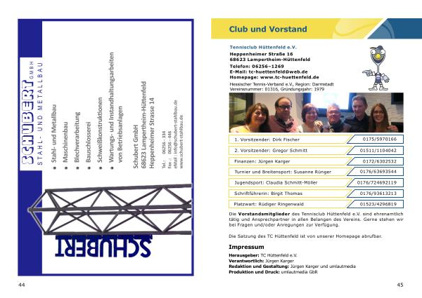 Herausgeber : TC Hüttenfeld e . V . Verantwortlich : Jürgen Karger Redaktion und Gestaltung : Jürgen Karger und umlautmedia Produktion und Druck : umlautmedia GbR