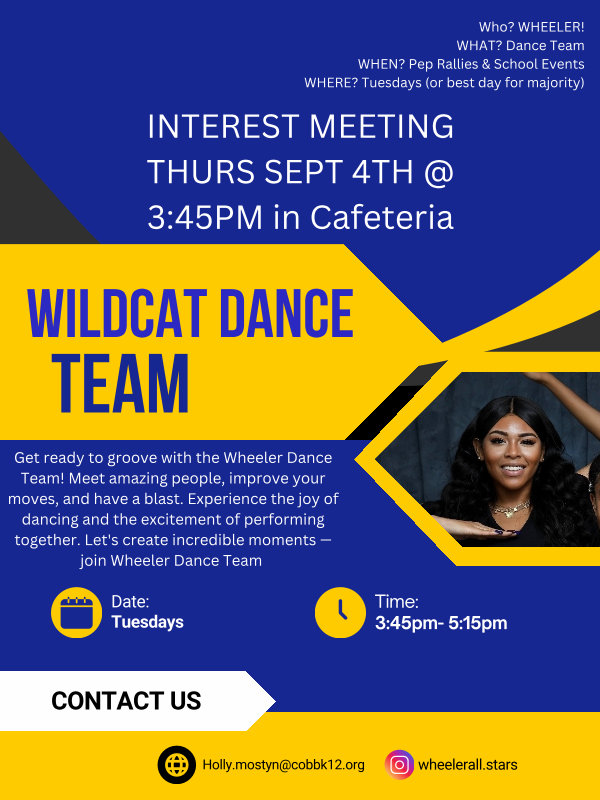 Get ready to groove with the Wheeler Dance Team! Meet amazing people, improve your moves, and have a blast. Experience the joy of dancing and the excitement of performing together. Let ' s create incredible moments— join Wheeler Dance Team