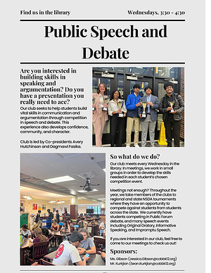 Meetings not enough ? Throughout the year , we take members of the clubs to regional and state NSDA tournaments where they have an opportunity to compete against students from students across the state . We currently have students competing in Public Forum debate , and many speech events including Original Oratory , Informative Speaking , and Impromptu Speech .