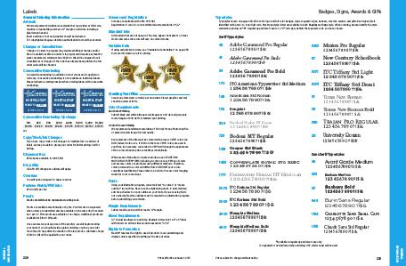Typestyles shown on pages 229-231 are for logo and full color badges, signs, magnetic signs, banners, vinyl art, awards, and gifts. Each typestyle is identified with a two- to four-digit code. Most typestyles listed are available in both Regular and Caps style. When ordering, please identify the style wanted by placing an“ R”( regular upper / lower case) or a“ C”( all caps) behind the typestyle code you have chosen.
