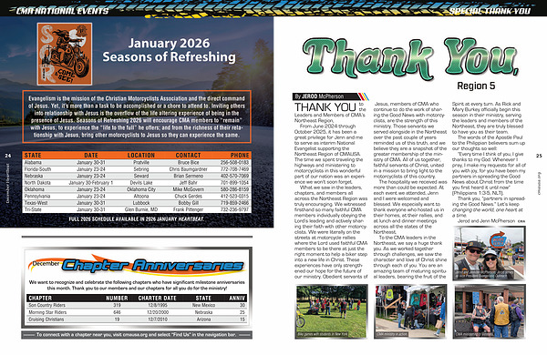 From June 2024 through October 2025, it has been a great privilege for Jenn and me to serve as interim National Evangelist supporting the Northeast Region of CMAUSA. The time we spent traveling the highways and ministering to motorcyclists in this wonderful part of our nation was an experience we wonβ t soon forget.