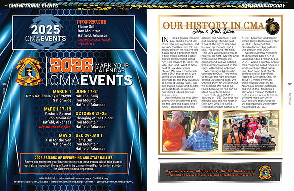 We are currently members of Spirit of the Son # 777 in Columbus, Ohio. From 2004 to 2023, I wrote a spiritual article for a magazine called Ride On. I wrote a column titledβ More Like Him.β I also held church services and an Easy Rider Rodeo at Chillicothe, Ohio, for about 17 years. I went on three mission trips: one to Nicaragua, one to Guatemala, and one to the Philippines. I also won a mission trip that I had to give away due to illness. We have loved our time in CMA and are thankful for all the opportunities the ministry has brought us. CMA