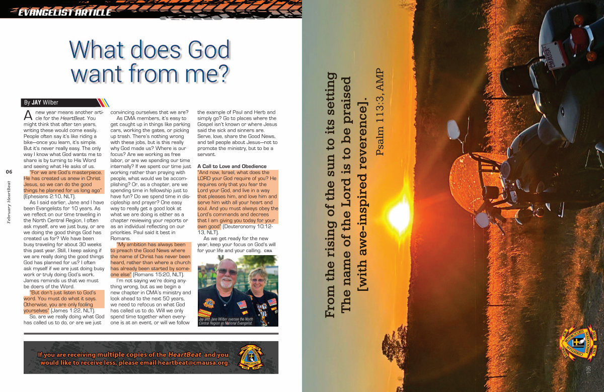 A new year means another article for the HeartBeat. You might think that after ten years, writing these would come easily. People often say it’ s like riding a bike— once you learn, it’ s simple. But it’ s never really easy. The only way I know what God wants me to share is by turning to His Word and seeing what He asks of us.