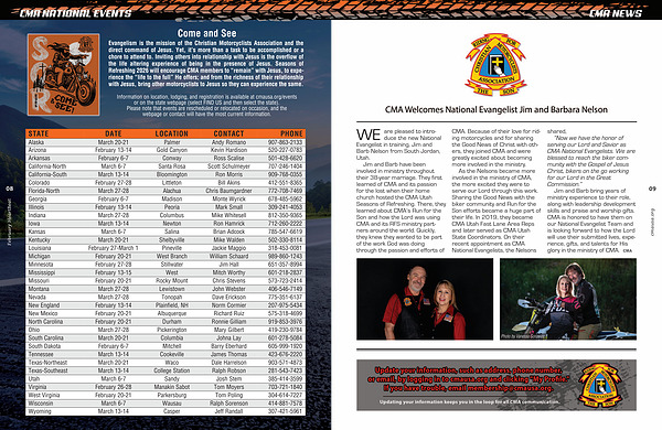 “ Now we have the honor of serving our Lord and Savior as CMA National Evangelists. We are blessed to reach the biker community with the Gospel of Jesus Christ, bikers on the go working for our Lord in the Great Commission.”