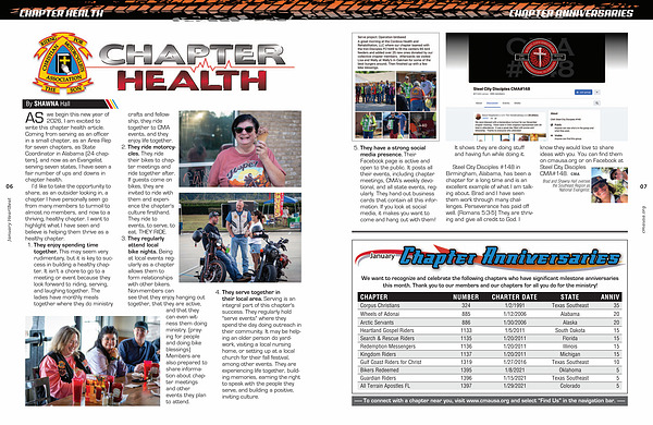 Iā d like to take the opportunity to share, as an outsider looking in, a chapter I have personally seen go from many members to turmoil to almost no members, and now to a thriving, healthy chapter. I want to highlight what I have seen and believe is helping them thrive as a healthy chapter. 1. They enjoy spending time together. This may seem very rudimentary, but it is key to success in building a healthy chapter. It isn ' t a chore to go to a meeting or event because they look forward to riding, serving, and laughing together. The ladies have monthly meals together where they do ministry