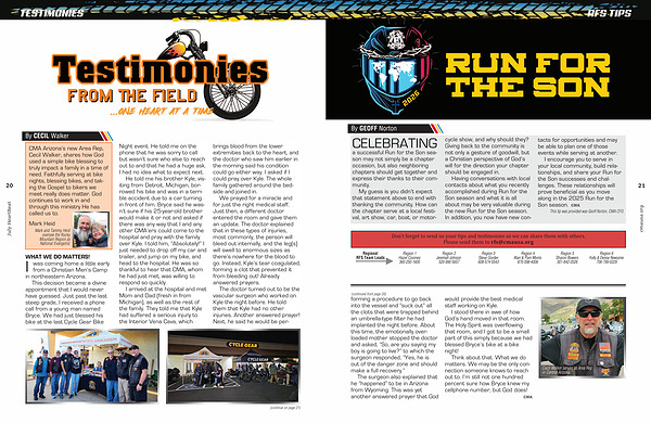 Having conversations with local contacts about what you recently accomplished during Run for the Son season and what it is all about may be very valuable during the new Run for the Son season. In addition, you now have new contacts for opportunities and may be able to plan one of those events while serving at another. I encourage you to serve in your local community, build relationships, and share your Run for the Son successes and challenges. These relationships will prove beneficial as you move along in the 2025 Run for the Son season. CMA