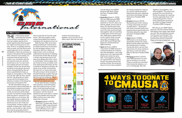 THE motorcycling season has kicked into full gear in the northern hemisphere. Iβ m hearing multiple reports of the prayer opportunities God has given our nations as they go out in ministry. There is no question that the need is great, and that God is working through each of our members worldwide to reach out and have an impact in the places He has planted them. Amid so much activity, it is important that we take time to invest in our connection with the Lord and the vision for what He would have us do. You see, there are multiple avenues of ministry available, and we can almost drive ourselves crazy trying to be everywhere, doing everything. But we serve a good God who loves us, equips us, and guides us. He invites us to be still, seek His face, and follow Him. He will guide our paths, and we will find ourselves more effective ministers of His Gospel as we remain connected to Him.