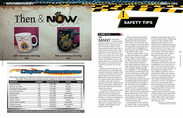 Ride like you are invisible because, to many drivers, you are invisible. Safety is your responsibility; don’ t count on others for your safety. Other drivers don’ t want to hurt you. Sometimes, they really don’ t see you. CMA