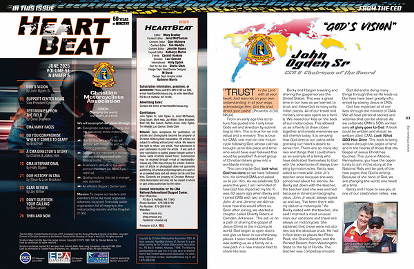 This can only be God, look what God has done as we have followed him. He birthed CMA and asked us to join Him. As we celebrate 50 years this year, I am reminded of how God has impacted my life. It was 43 years ago when Becky and I joined CMA with two small boys, John Jr and Jeremy; we did not know how this would affect us. Soon after joining, we started a chapter called Charity Riders in Camden, Arkansas. This set us on a path of sharing the gospel of Jesus Christ in the motorcycle world. God began to open doors and give us favor in out-of-the-way places. I soon realized that God was setting us as a family on a new path in a new mission field to share His love.
