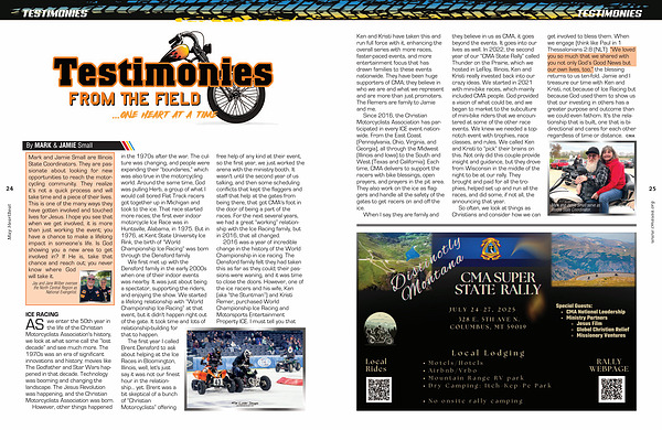 they believe in us as CMA, it goes beyond the events. It goes into our lives as well. In 2022, the second year of ourβ CMA State Rallyβ called Thunder on the Prairie, which we hosted in LeRoy, Illinois, Ken and Kristi really invested back into our crazy ideas. We started in 2021 with mini-bike races, which mainly included CMA people. God provided a vision of what could be, and we began to market to the subculture of mini-bike riders that we encountered at some of the other race events. We knew we needed a topnotch event with trophies, race classes, and rules. We called Ken and Kristi toβ pickβ their brains on this. Not only did this couple provide insight and guidance, but they drove from Wisconsin in the middle of the night to be at our rally. They brought and paid for all the trophies, helped set up and run all the races, and did some, if not all, the announcing that year.