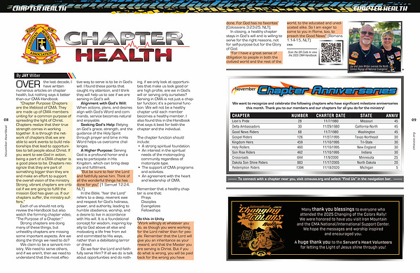 In closing, a healthy chapter stays in Godβ s will and is willing to serve for the right reasons, not for self-purpose but for the Glory of God.