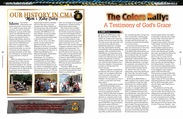 MARK has owned motorcycles and loved riding them since he was 12, so after he was saved and we were married, he started looking for a group of Christian riders. He attended the local chapterβ s meetings, Bikers for Christ, and went to his first Daytona Bike Week, where he met Curtis Clements and Greg Heinritz from CMA National. After that, he applied and became a member in 1987. I joined shortly after, as my first memories are of bringing our youngest daughter to the chapter meetings in her baby carrier, as she was born in April of 1987.