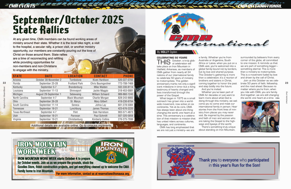 CELEBRATING 50 YEARS October, a truly global celebration will THIS take place on Iron Mountain in Hatfield, Arkansas, as members of CMA gather from nearly all 34 nations of our international family to celebrate 50 years of ministry to motorcyclists. This golden anniversary marks not only a significant milestone in timeโ but a living testimony of hearts changed and lives transformed through the power of the Gospel. What began in 1975 as a small outreach has grown into a worldwide movement, now active on six continents. Yet at its core, CMA has always been about one thing: changing the world, one heart at a time. This anniversary is a celebration of that missionโ a mission that has united riders across cultures, languages, and continents.