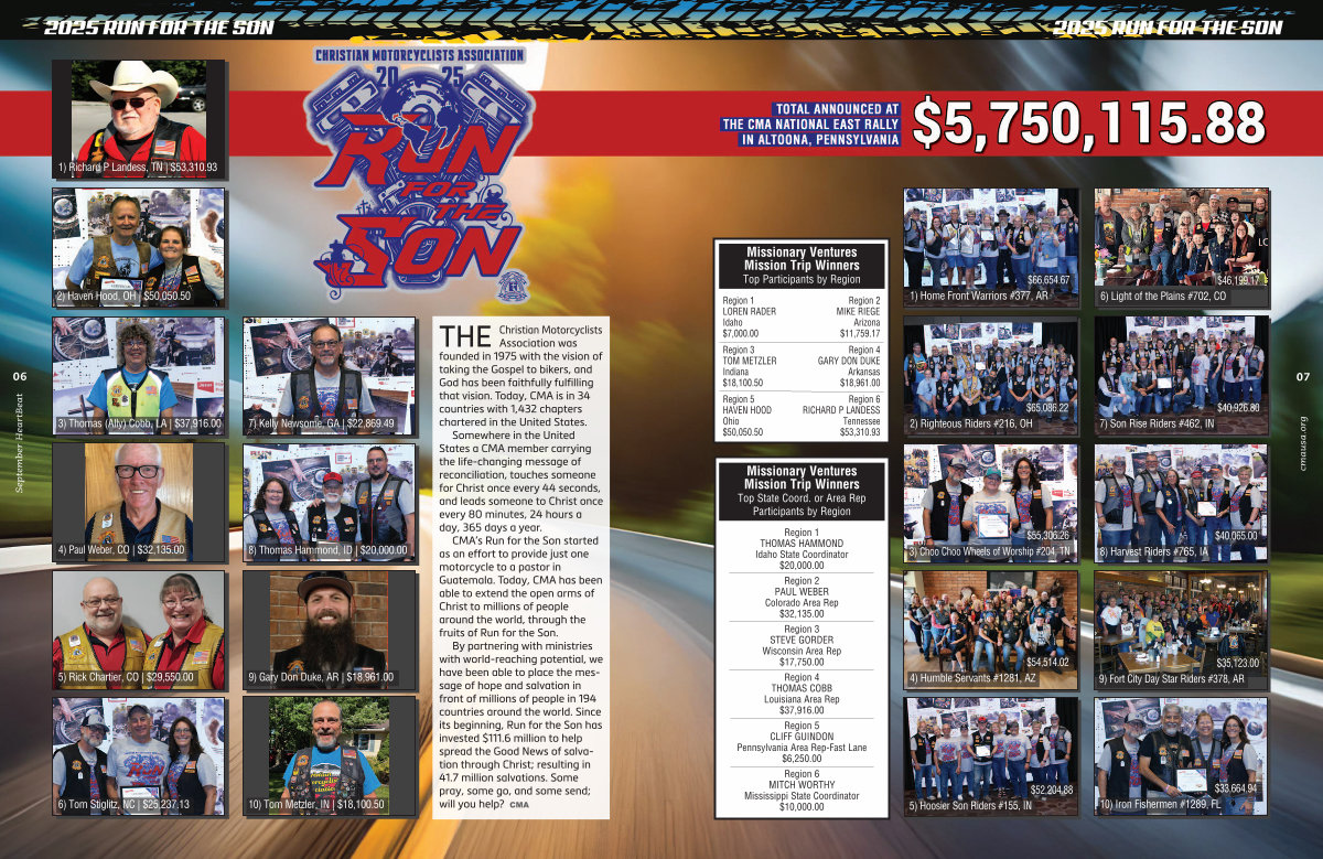 CMA’ s Run for the Son started as an effort to provide just one motorcycle to a pastor in Guatemala. Today, CMA has been able to extend the open arms of Christ to millions of people around the world, through the fruits of Run for the Son.