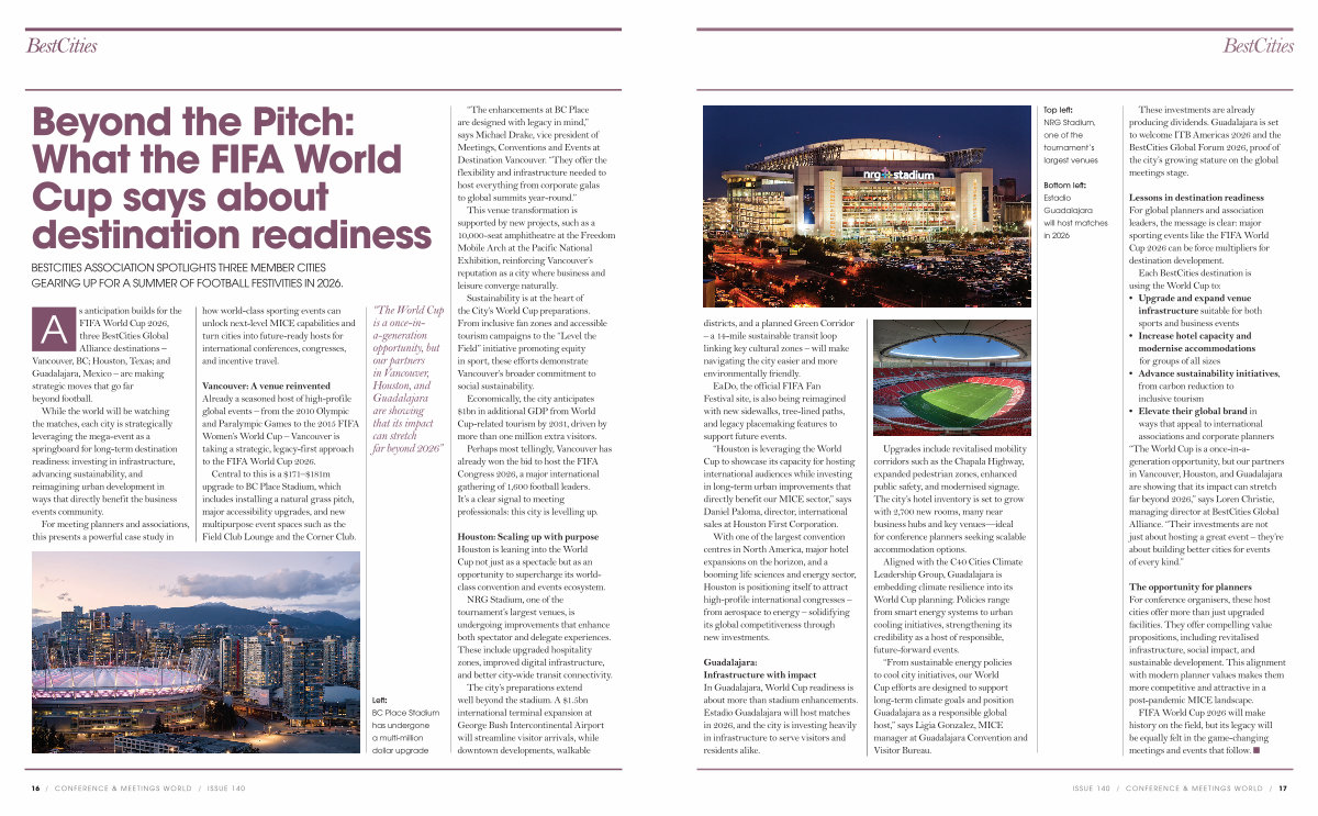 “ The World Cup is a once-in-ageneration opportunity, but our partners in Vancouver, Houston, and Guadalajara are showing that its impact can stretch far beyond 2026,” says Loren Christie, managing director at BestCities Global Alliance.“ Their investments are not just about hosting a great event – they’ re about building better cities for events of every kind.”