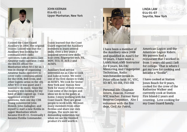 I use some of the recipes and ideas we do in the galley at home. I enjoy working with the Coast Guard. They are great people to work with. We meet many members from other flotillas and share our own recipes. The work can be demanding sometimes but when we see the finished product it’s well worth it.