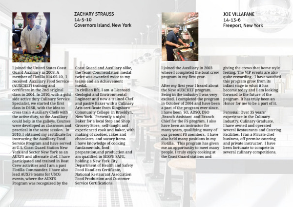 After my first year I heard about the New AUXCHEF program. Being in the industry I was very excited. I completed the program in October of 2004 and have been a part of the program ever since. I have been SO, ADSO, DSO ,Branch Assistant and Branch Chief for the FS program. I also have been an instructor for many years, qualifying many of our present FS members. I have also held many positions in my Flotilla. This program has given me an opportunity to meet many people. I truly enjoy cooking at the Coast Guard stations and giving the crews that home style feeling. The VIP events are also quite rewarding. I have watched this program grow from its infant stage to what it has become today and I am looking forward to the future of the program. It has truly been an Honor for me to be a part of it.