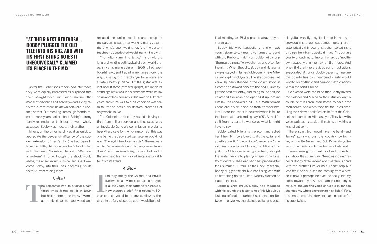 Bobby, his wife Natascha, and their two young daughters, though, continued to bond with the Parbers, making a tradition of visiting“ the grandparents” on weekends, and often for the night. When they did, Bobby and Natascha always stayed in James’ old room, where Milena had kept his old guitar. The shabby case had variously been stashed in the closet, stood in a corner, or stowed beneath the bed. Curiosity got the best of Bobby, and rising to the bait, he unlatched the case and opened it up: before him lay the road-worn’ 56 Tele. With broken knobs and a pickup sprung from its moorings, it still bore the scars it incurred when it fell to the floor that heartrending day in’ 91. As he lifted it from its case, he wondered what it might have to say.