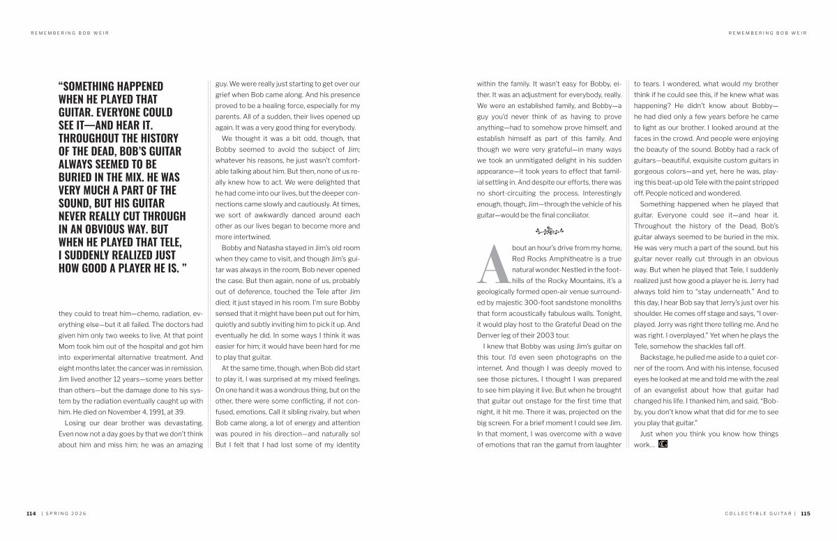 Something happened when he played that guitar. Everyone could see it— and hear it. Throughout the history of the Dead, Bob’ s guitar always seemed to be buried in the mix. He was very much a part of the sound, but his guitar never really cut through in an obvious way. But when he played that Tele, I suddenly realized just how good a player he is. Jerry had always told him to“ stay underneath.” And to this day, I hear Bob say that Jerry’ s just over his shoulder. He comes off stage and says,“ I overplayed. Jerry was right there telling me. And he was right. I overplayed.” Yet when he plays the Tele, somehow the shackles fall off.