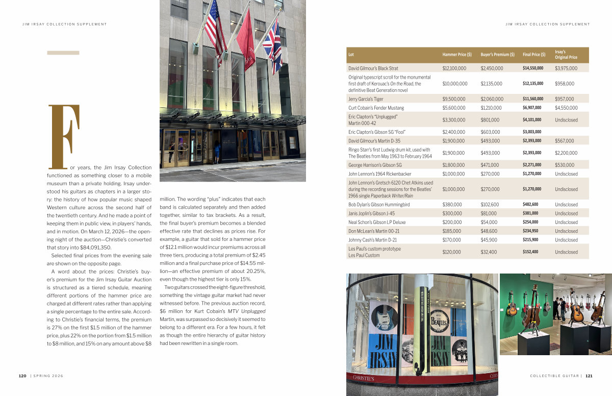 For years, the Jim Irsay Collection functioned as something closer to a mobile museum than a private holding. Irsay understood his guitars as chapters in a larger story: the history of how popular music shaped Western culture across the second half of the twentieth century. And he made a point of keeping them in public view, in players’ hands, and in motion. On March 12, 2026— the opening night of the auction— Christie’ s converted that story into $ 84,091,350.