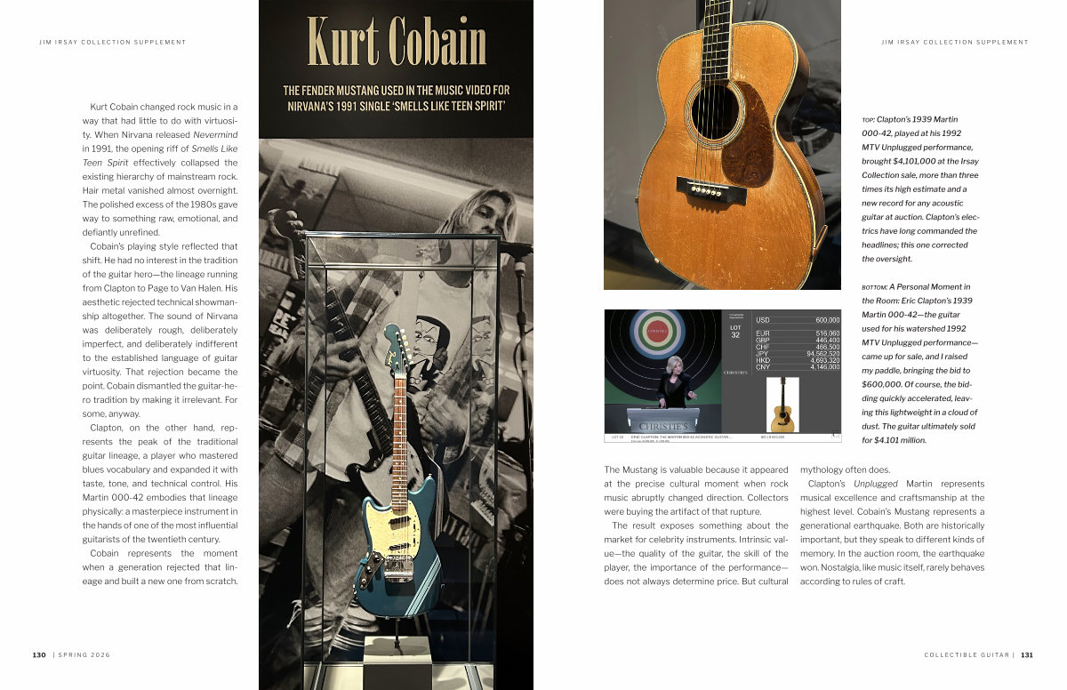 Clapton, on the other hand, represents the peak of the traditional guitar lineage, a player who mastered blues vocabulary and expanded it with taste, tone, and technical control. His Martin 000-42 embodies that lineage physically: a masterpiece instrument in the hands of one of the most influential guitarists of the twentieth century.