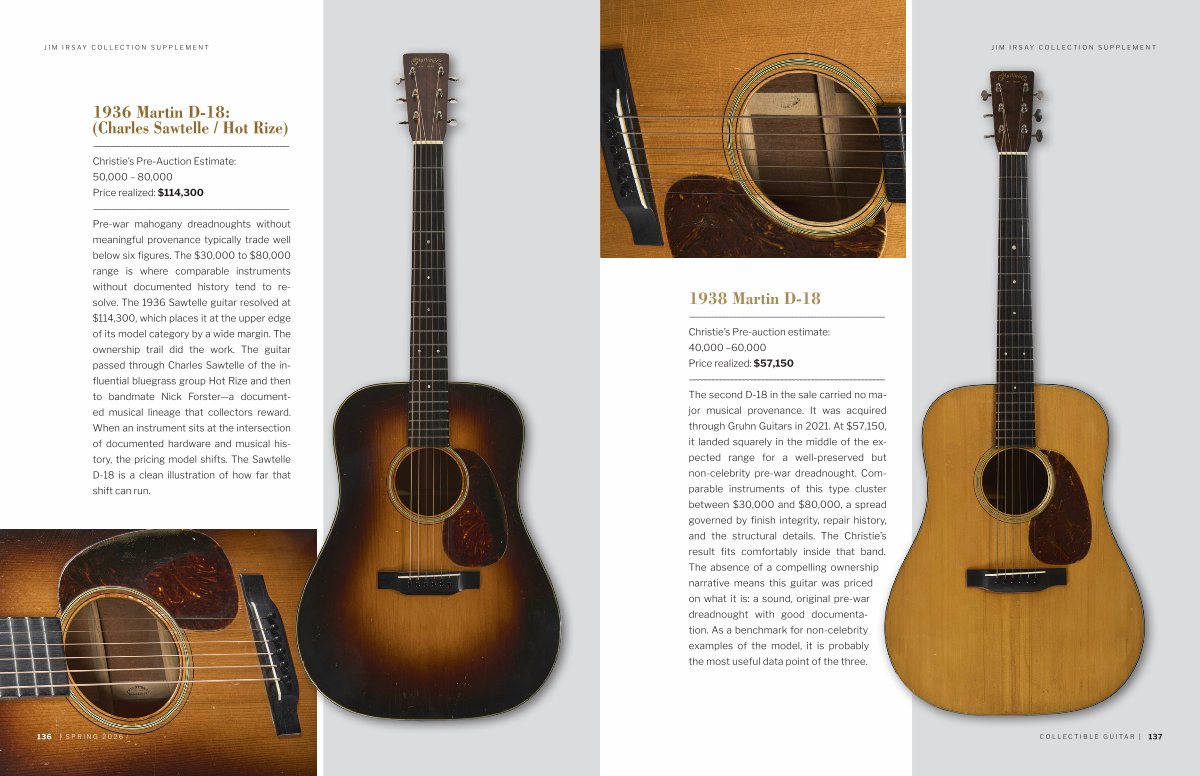 ––––––––––––––––––––––––––––––––––––––––––––––––––– Christie’ s Pre-auction estimate: 40,000 – 60,000 Price realized: $ 57,150 ––––––––––––––––––––––––––––––––––––––––––––––––––– The second D-18 in the sale carried no major musical provenance. It was acquired through Gruhn Guitars in 2021. At $ 57,150, it landed squarely in the middle of the expected range for a well-preserved but non-celebrity pre-war dreadnought. Comparable instruments of this type cluster between $ 30,000 and $ 80,000, a spread governed by finish integrity, repair history, and the structural details. The Christie’ s result fits comfortably inside that band. The absence of a compelling ownership narrative means this guitar was priced on what it is: a sound, original pre-war dreadnought with good documentation. As a benchmark for non-celebrity examples of the model, it is probably the most useful data point of the three.