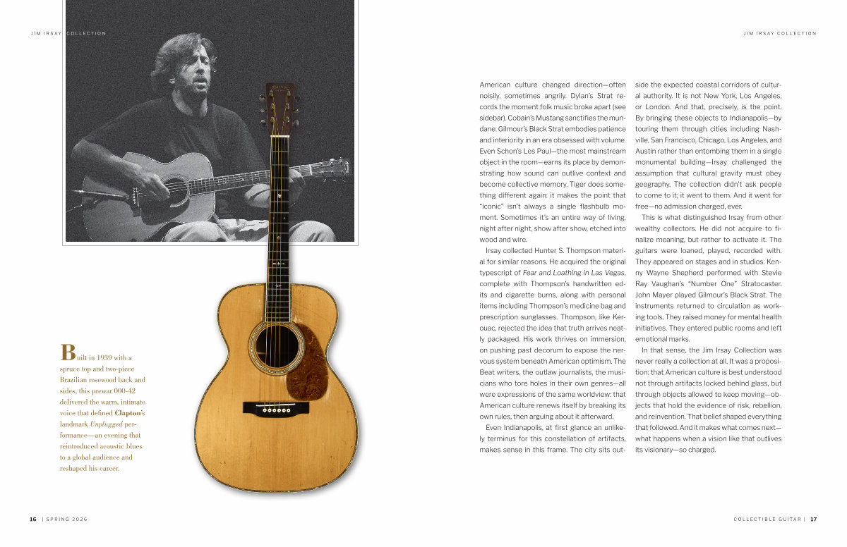 Built in 1939 with a spruce top and two-piece Brazilian rosewood back and sides, this prewar 000-42 delivered the warm, intimate voice that defined Clapton’ s landmark Unplugged performance— an evening that reintroduced acoustic blues to a global audience and reshaped his career.