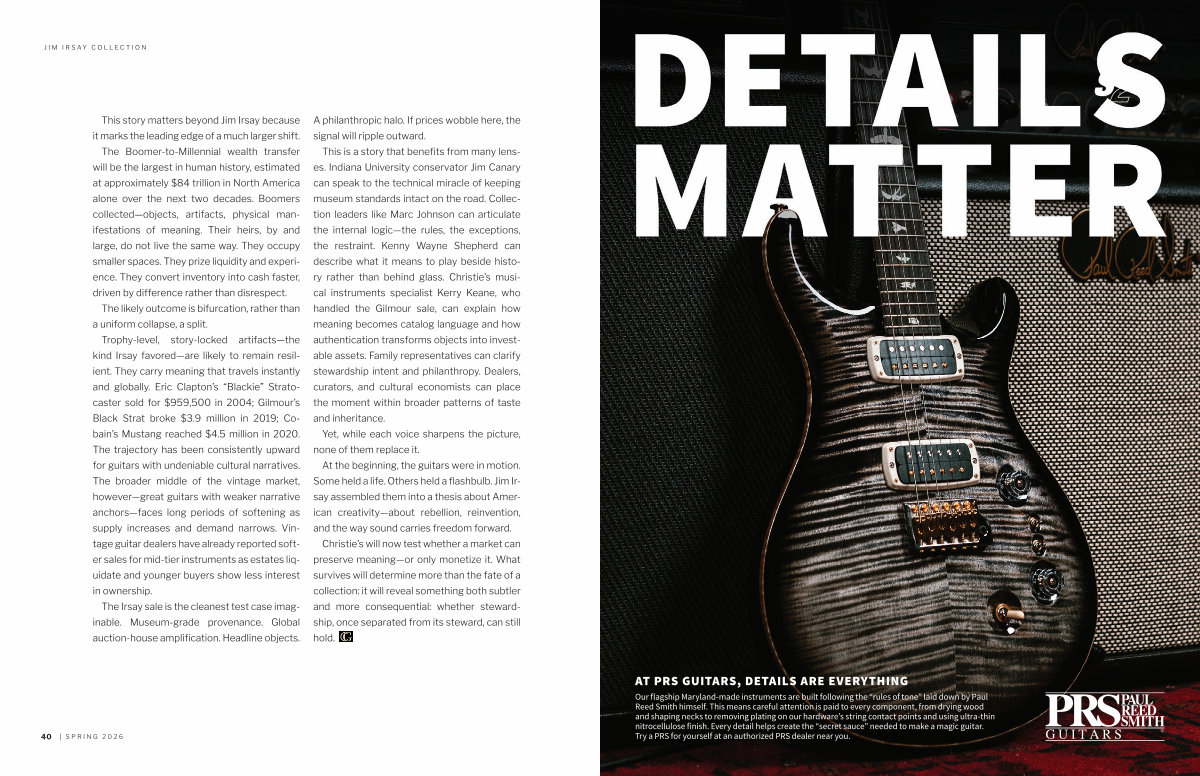 Trophy-level, story-locked artifacts— the kind Irsay favored— are likely to remain resilient. They carry meaning that travels instantly and globally. Eric Clapton’ s“ Blackie” Stratocaster sold for $ 959,500 in 2004; Gilmour’ s Black Strat broke $ 3.9 million in 2019; Cobain’ s Mustang reached $ 4.5 million in 2020. The trajectory has been consistently upward for guitars with undeniable cultural narratives. The broader middle of the vintage market, however— great guitars with weaker narrative anchors— faces long periods of softening as supply increases and demand narrows. Vintage guitar dealers have already reported softer sales for mid-tier instruments as estates liquidate and younger buyers show less interest in ownership.