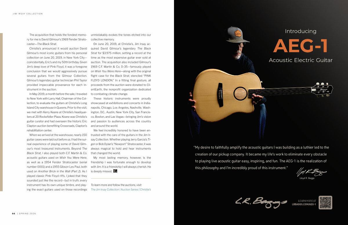On June 20, 2019, at Christie’ s, Jim Irsay acquired David Gilmour’ s legendary The Black Strat for $ 3.975 million, setting a record at the time as the most expensive guitar ever sold at auction. The acquisition also included Gilmour’ s 1969 C. F. Martin & Co. D-35— famously played on Wish You Were Here— along with the original flight case for the Black Strat, stenciled“ PINK FLOYD LONDON.” In a fitting final gesture, all proceeds from the auction were donated to ClientEarth, the nonprofit organization dedicated to combating climate change.