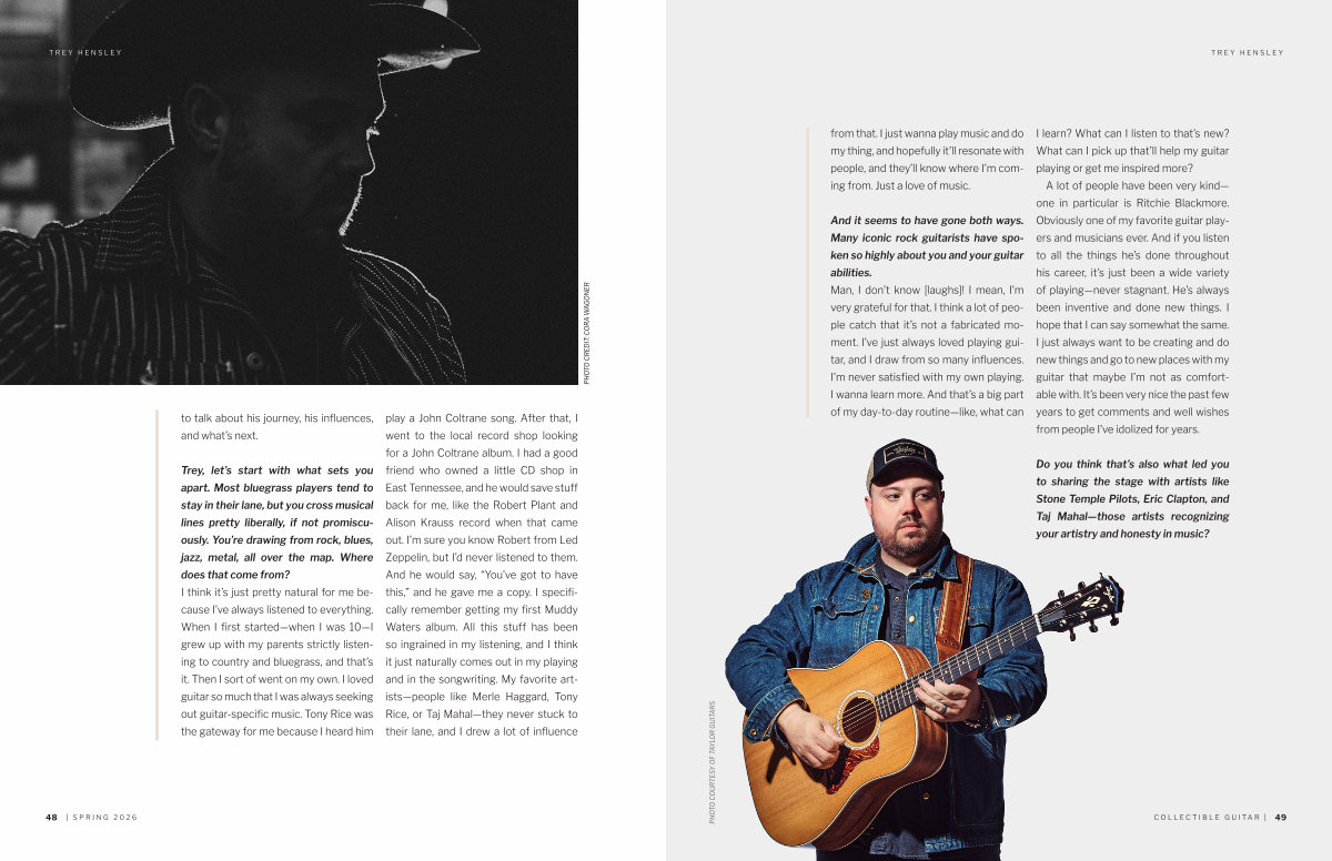 Trey, let’ s start with what sets you apart. Most bluegrass players tend to stay in their lane, but you cross musical lines pretty liberally, if not promiscuously. You’ re drawing from rock, blues, jazz, metal, all over the map. Where does that come from? I think it’ s just pretty natural for me because I’ ve always listened to everything. When I first started— when I was 10— I grew up with my parents strictly listening to country and bluegrass, and that’ s it. Then I sort of went on my own. I loved guitar so much that I was always seeking out guitar-specific music. Tony Rice was the gateway for me because I heard him play a John Coltrane song. After that, I went to the local record shop looking for a John Coltrane album. I had a good friend who owned a little CD shop in East Tennessee, and he would save stuff back for me, like the Robert Plant and Alison Krauss record when that came out. I’ m sure you know Robert from Led Zeppelin, but I’ d never listened to them. And he would say,“ You’ ve got to have this,” and he gave me a copy. I specifically remember getting my first Muddy Waters album. All this stuff has been so ingrained in my listening, and I think it just naturally comes out in my playing and in the songwriting. My favorite artists— people like Merle Haggard, Tony Rice, or Taj Mahal— they never stuck to their lane, and I drew a lot of influence