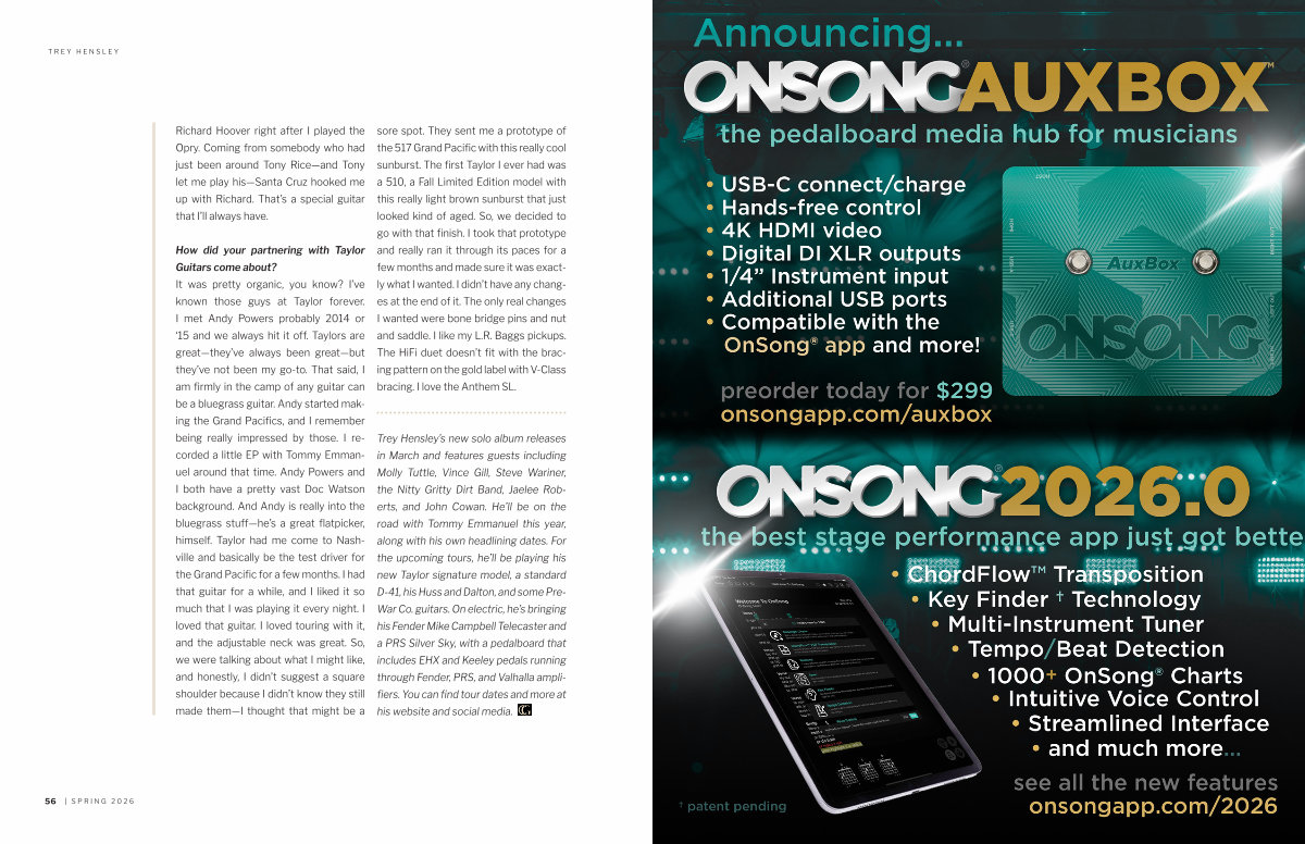 Trey Hensley’ s new solo album releases in March and features guests including Molly Tuttle, Vince Gill, Steve Wariner, the Nitty Gritty Dirt Band, Jaelee Roberts, and John Cowan. He’ ll be on the road with Tommy Emmanuel this year, along with his own headlining dates. For the upcoming tours, he’ ll be playing his new Taylor signature model, a standard D-41, his Huss and Dalton, and some Pre- War Co. guitars. On electric, he’ s bringing his Fender Mike Campbell Telecaster and a PRS Silver Sky, with a pedalboard that includes EHX and Keeley pedals running through Fender, PRS, and Valhalla amplifiers. You can find tour dates and more at his website and social media.