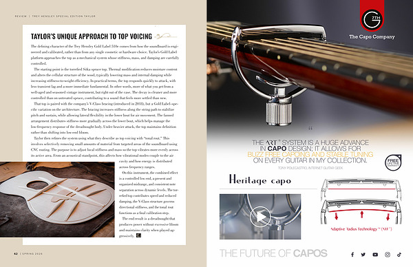 The defining character of the Trey Hensley Gold Label 510e comes from how the soundboard is engineered and calibrated, rather than from any single cosmetic or hardware choice. Taylor’ s Gold Label platform approaches the top as a mechanical system whose stiffness, mass, and damping are carefully controlled.