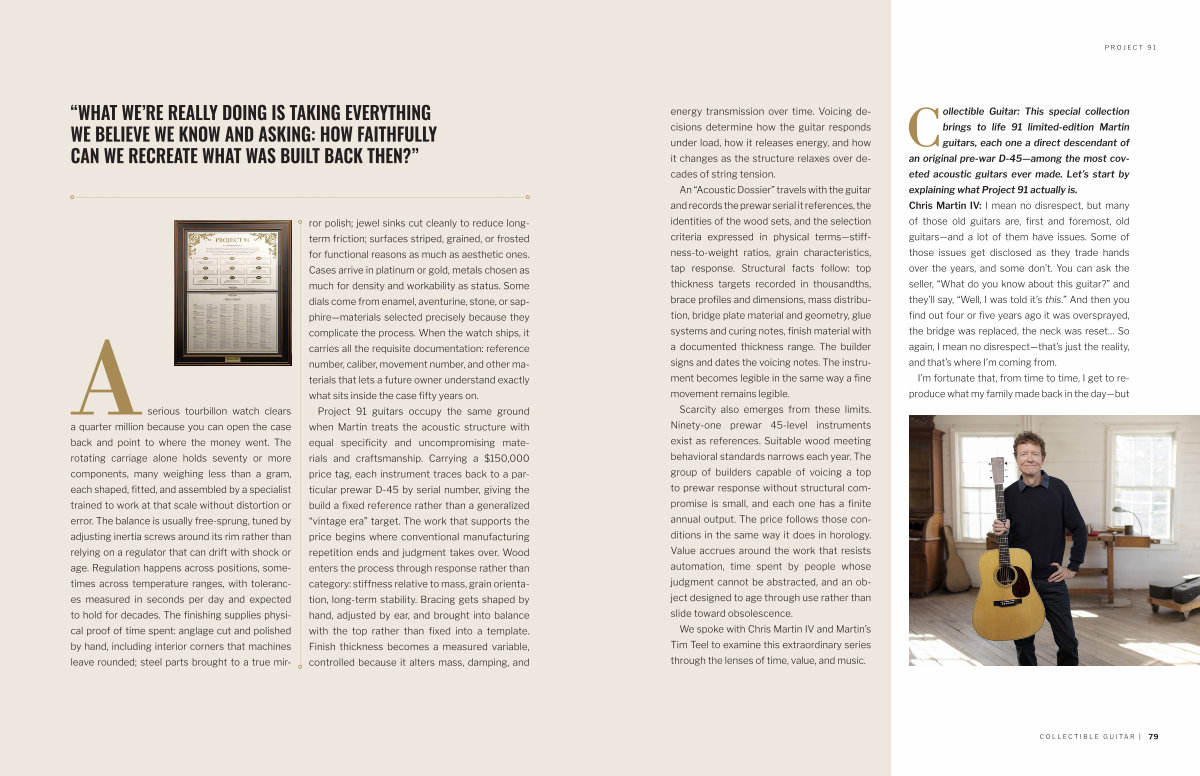 Project 91 guitars occupy the same ground when Martin treats the acoustic structure with equal specificity and uncompromising materials and craftsmanship. Carrying a $ 150,000 price tag, each instrument traces back to a particular prewar D-45 by serial number, giving the build a fixed reference rather than a generalized“ vintage era” target. The work that supports the price begins where conventional manufacturing repetition ends and judgment takes over. Wood enters the process through response rather than category: stiffness relative to mass, grain orientation, long-term stability. Bracing gets shaped by hand, adjusted by ear, and brought into balance with the top rather than fixed into a template. Finish thickness becomes a measured variable, controlled because it alters mass, damping, and