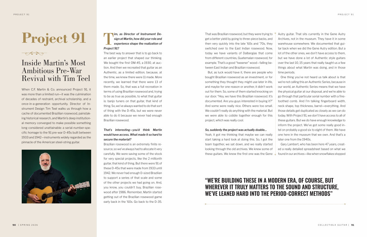 When C. F. Martin & Co. announced Project 91, it was more than a limited run— it was the culmination of decades of restraint, archival scholarship, and a once-in-a-generation opportunity. Director of Instrument Design Tim Teel walks us through how a cache of documented Brazilian rosewood, painstaking historical research, and Martin’ s deep institutional memory converged to make possible something long considered unattainable: a serial-number-specific homage to the 91 pre-war D-45s built between 1933 and 1942— instruments widely regarded as the pinnacle of the American steel-string guitar.