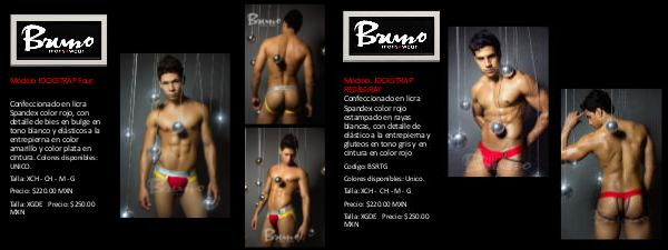 Confeccionado en licra Spandex color rojo, con detalle de bies en bulge en tono blanco y elásticos a la entrepierna en color amarillo y color plata en cintura. Colores disponibles: UNICO.
