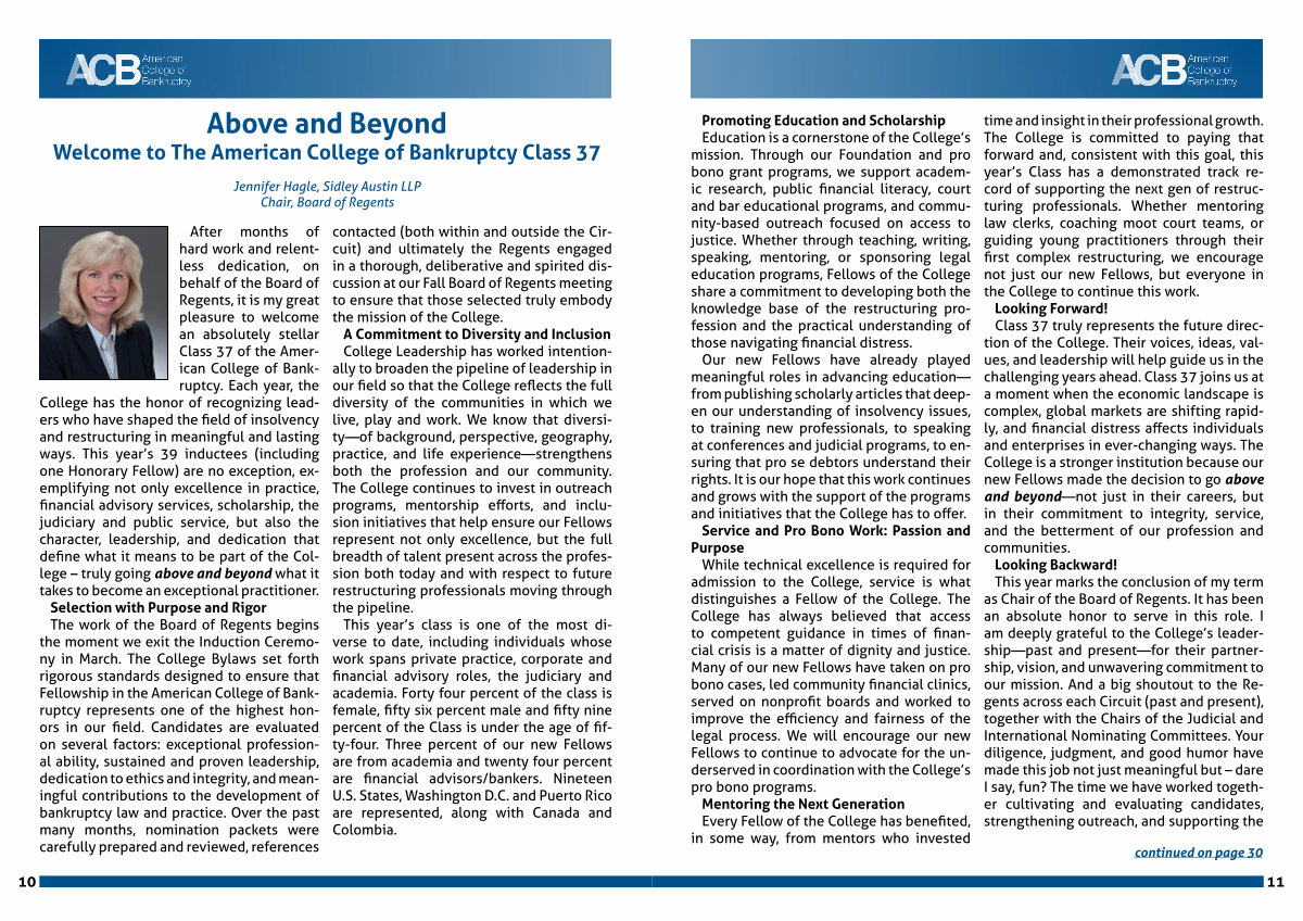 time and insight in their professional growth. The College is committed to paying that forward and, consistent with this goal, this year’ s Class has a demonstrated track record of supporting the next gen of restructuring professionals. Whether mentoring law clerks, coaching moot court teams, or guiding young practitioners through their first complex restructuring, we encourage not just our new Fellows, but everyone in the College to continue this work. Looking Forward! Class 37 truly represents the future direction of the College. Their voices, ideas, values, and leadership will help guide us in the challenging years ahead. Class 37 joins us at a moment when the economic landscape is complex, global markets are shifting rapidly, and financial distress affects individuals and enterprises in ever-changing ways. The College is a stronger institution because our new Fellows made the decision to go above and beyond— not just in their careers, but in their commitment to integrity, service, and the betterment of our profession and communities. Looking Backward! This year marks the conclusion of my term as Chair of the Board of Regents. It has been an absolute honor to serve in this role. I am deeply grateful to the College’ s leadership— past and present— for their partnership, vision, and unwavering commitment to our mission. And a big shoutout to the Regents across each Circuit( past and present), together with the Chairs of the Judicial and International Nominating Committees. Your diligence, judgment, and good humor have made this job not just meaningful but – dare I say, fun? The time we have worked together cultivating and evaluating candidates, strengthening outreach, and supporting the