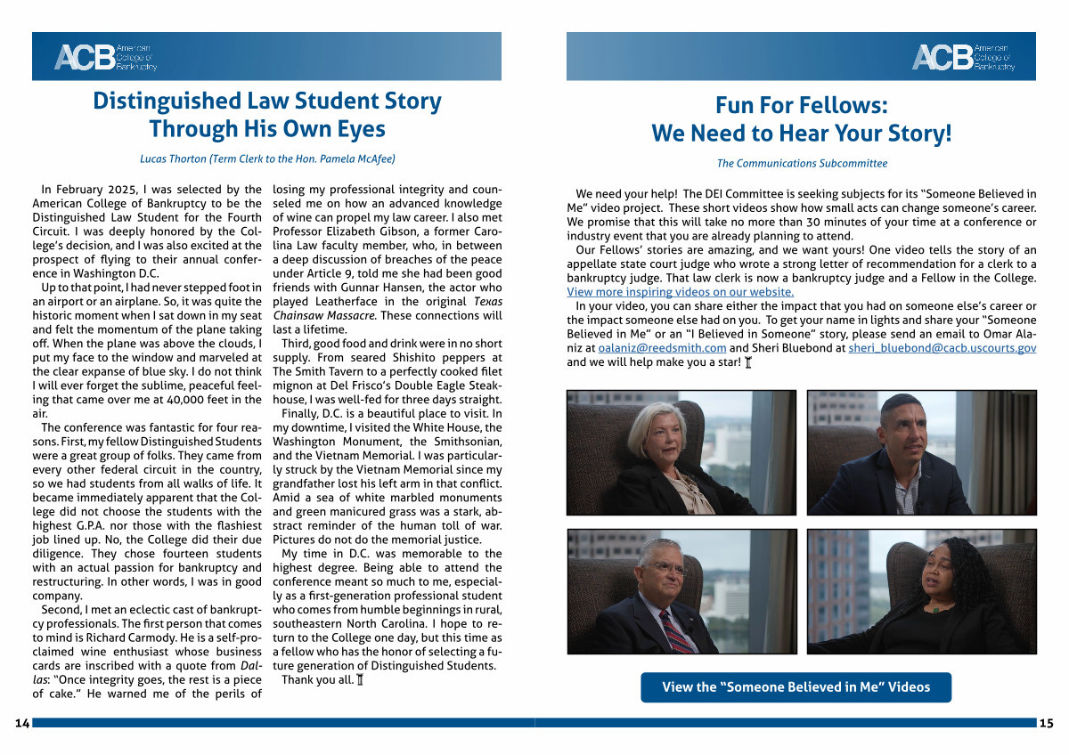 Our Fellows’ stories are amazing, and we want yours! One video tells the story of an appellate state court judge who wrote a strong letter of recommendation for a clerk to a bankruptcy judge. That law clerk is now a bankruptcy judge and a Fellow in the College. View more inspiring videos on our website.
