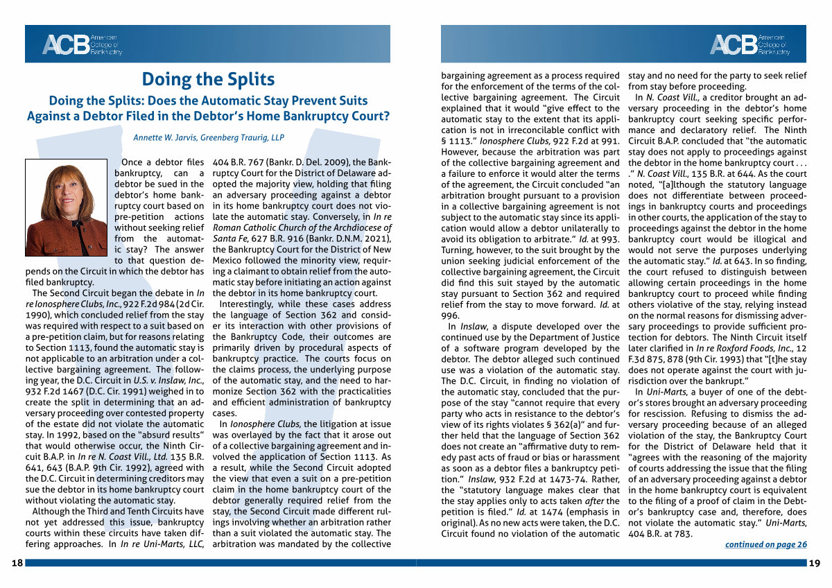 The Second Circuit began the debate in In re Ionosphere Clubs, Inc., 922 F. 2d 984( 2d Cir. 1990), which concluded relief from the stay was required with respect to a suit based on a pre-petition claim, but for reasons relating to Section 1113, found the automatic stay is not applicable to an arbitration under a collective bargaining agreement. The following year, the D. C. Circuit in U. S. v. Inslaw, Inc., 932 F. 2d 1467( D. C. Cir. 1991) weighed in to create the split in determining that an adversary proceeding over contested property of the estate did not violate the automatic stay. In 1992, based on the“ absurd results” that would otherwise occur, the Ninth Circuit B. A. P. in In re N. Coast Vill., Ltd. 135 B. R. 641, 643( B. A. P. 9th Cir. 1992), agreed with the D. C. Circuit in determining creditors may sue the debtor in its home bankruptcy court without violating the automatic stay.
