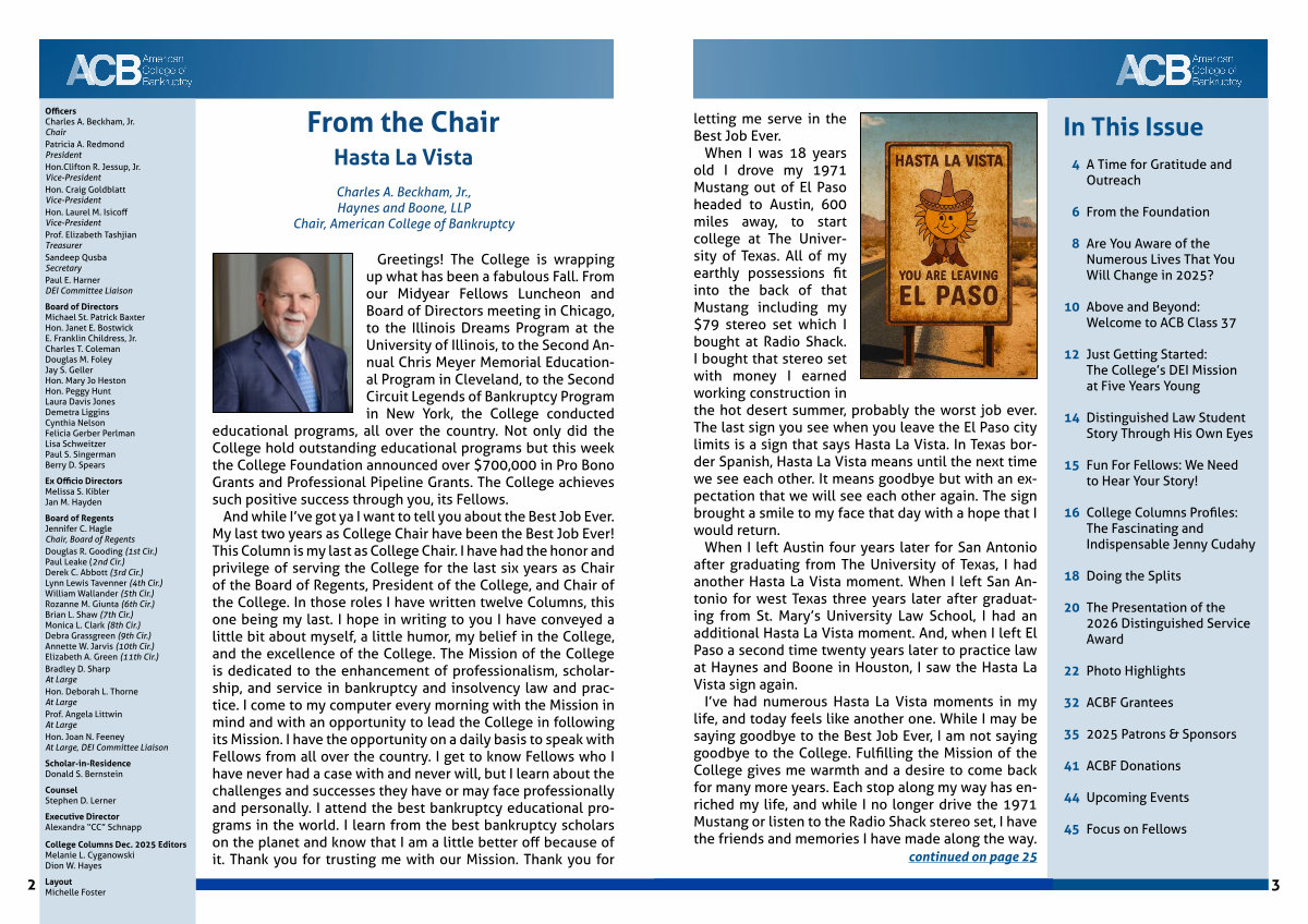 Greetings! The College is wrapping up what has been a fabulous Fall. From our Midyear Fellows Luncheon and Board of Directors meeting in Chicago, to the Illinois Dreams Program at the University of Illinois, to the Second Annual Chris Meyer Memorial Educational Program in Cleveland, to the Second Circuit Legends of Bankruptcy Program in New York, the College conducted educational programs, all over the country. Not only did the College hold outstanding educational programs but this week the College Foundation announced over $ 700,000 in Pro Bono Grants and Professional Pipeline Grants. The College achieves such positive success through you, its Fellows.