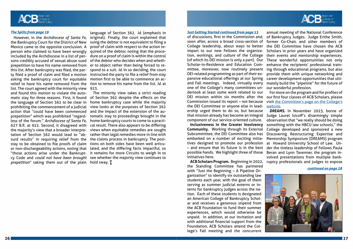ACB Scholars Program. Beginning in 2022, the Standing Committee has partnered with“ Just the Beginning – A Pipeline Organization” to identify six outstanding law students each year, with the goal of them serving as summer judicial externs or interns for bankruptcy judges across the nation. Each of these students is designated an American College of Bankruptcy Scholar and receives a generous stipend from the ACB Foundation to fund their summer experiences, which would otherwise be unpaid. In addition, at our invitation and with additional financial support from the Foundation, ACB Scholars attend the College’ s Fall meeting and the concurrent